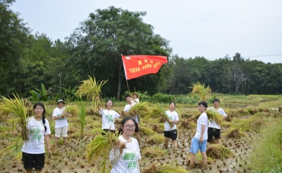 在西江镇西江村,队员们顶着烈日满怀热忱地来到村民许建昌的水稻田,他向队员们讲解收割标准,从分辨稻谷成熟度到握镰刀的姿势,从下镰的45度角到捆扎的“十字结”,手把手传授农耕技艺。金黄的稻穗在镰刀下簌簌倒下,汗水顺着队员脸颊滑落,滴入脚下的泥土,此刻,衣裤上星星点点的泥是最荣耀的勋章。夕阳下,两代人身影重合,是岁月与青春的对话,青年更应以汗水书写责任与担当,接续奋斗。