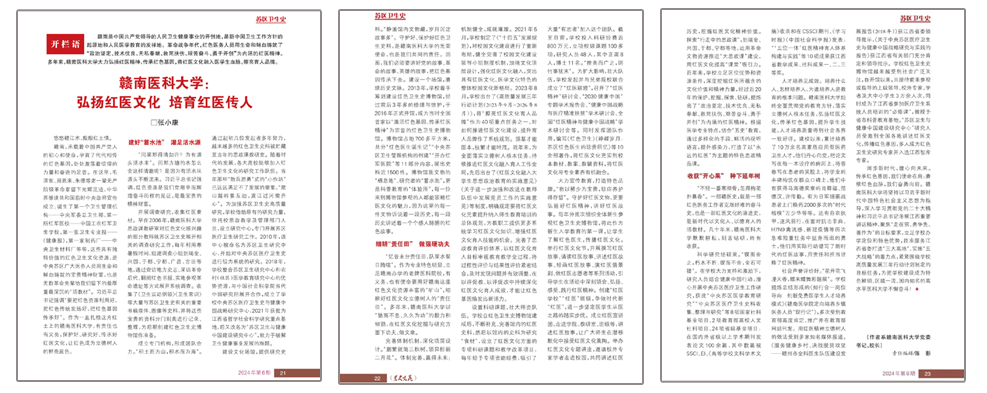 “作为一直扎根这片红土上的赣南医科大学,有责任也有义务,保护好、研究好、传承好红医文化,让红色成为立德树人的鲜亮底色。”近日,学校党委书记、校长张小康在2024年的第6期《党史文苑》杂志发表题为《赣南医科大学:弘扬红医文化 培育红医传人》的深度文章,系统疏理和总结了我校用红医精神立德树人的做法、特色、亮点,深入挖掘了红医精神的时代意义,阐述了红医文化的当代价值,受到社会广泛关注和积极认可,并被学习强国、人民网、江西日报客户端等多家媒体转载。