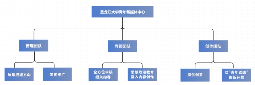 公众号在共青团黑龙江大学委员会的指导下,下设导师团队、创作团队、管理团队。一是导师团队“把方向”。发挥全方位审核把关指导作用,将思想政治教育融入内容创作全流程。二是创作团队“出点子”。负责提供创意,以“青年语态”创新开发涵盖图文、音视频、平面设计等多元形态的新媒体文化产品。三是管理团队“抓落实”。负责平台推广、运营维护等工作,确保党的教育方针和团组织工作部署有效落实。