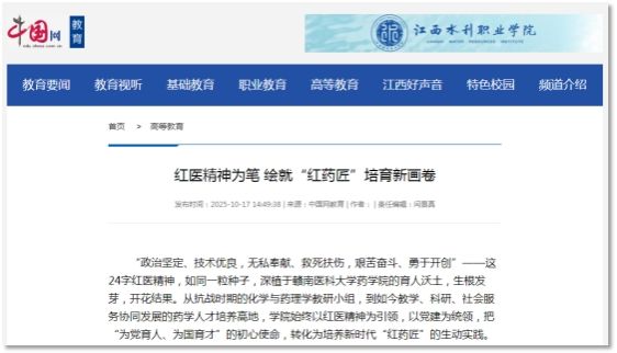 站在新的历史起点,学院将继续以红医精神铸魂育人,深耕“红药匠”培育沃土,让红色血脉在药学人才培养中生生不息,为健康中国建设贡献更多智慧和力量。这份跨越时空的精神传承,必将在新时代绽放出更加璀璨的光芒。(赣南医科大学罗丽萍)