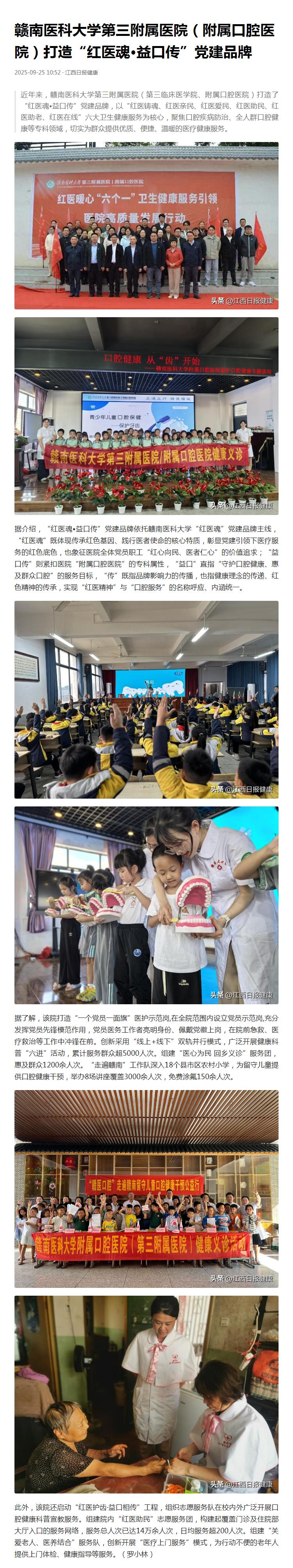 近年来,赣南医科大学第三附属医院(第三临床医学院、附属口腔医院)打造了“红医魂·益口传”党建品牌,聚焦口腔疾病防治、全人群口腔健康等专科领域,切实为群众提供优质、便捷、温暖的医疗健康服务。