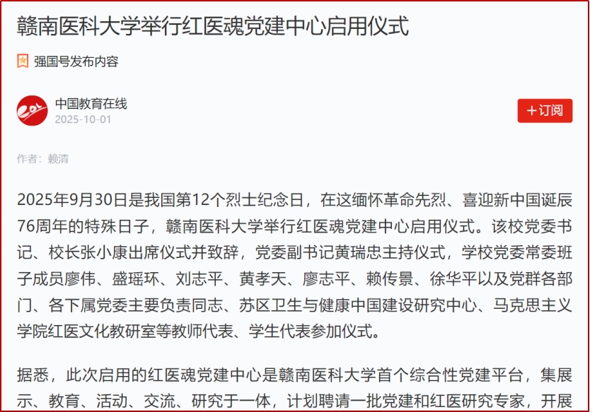 2025年9月30日是我国第12个烈士纪念日,在这缅怀革命先烈、喜迎新中国诞辰76周年的特殊日子,赣南医科大学举行红医魂党建中心启用仪式。该校党委书记、校长张小康出席仪式并致辞,党委副书记黄瑞忠主持仪式,学校党委常委班子成员廖伟、盛瑶环、刘志平、黄孝天、廖志平、赖传景、徐华平以及党群各部门、各下属党委主要负责同志、苏区卫生与健康中国建设研究中心、马克思主义学院红医文化教研室等教师代表、学生代表参加仪式。