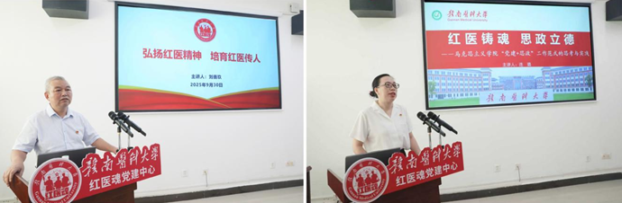 揭牌仪式后,中心举行了首场红医党课,苏区卫生与健康中国建设研究中心教授、著名的红医精神研究专家刘善玖以《弘扬红医精神 培育红医传人》为题,深情讲述了红医党建历史故事和红医精神在高校的传承与运用。马克思主义学院党委书记连璐以《红医铸魂、思政立德,马克思主义学院“党建 + 思政”工作范式的思考与实践》为题,分享了该校马克思主义学院在推进红医魂党建与思政教育深度融合、打造“红医马灯”党建特色品牌等方面的经验做法。