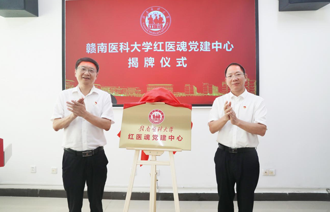 在全场热烈的掌声中,张小康、黄瑞忠共同为赣南医科大学红医魂党建中心揭牌。