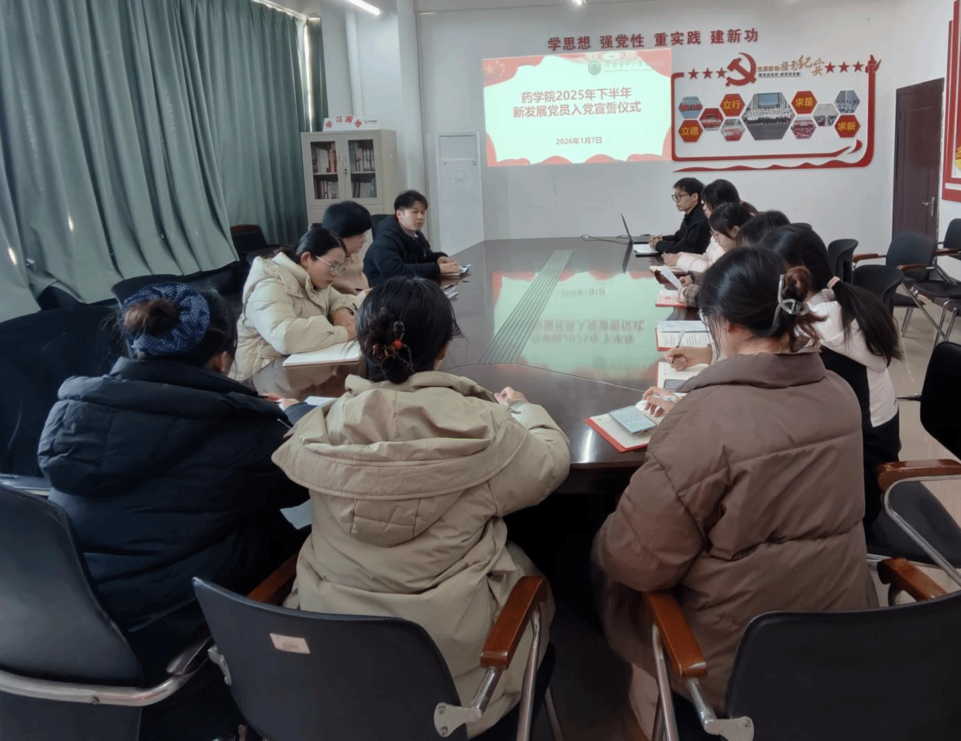 1月7日下午,药学院在蓉江校区举行2025年下半年新发展党员入党宣誓仪式。学院党委副书记罗丽萍、本科生党支部书记袁东波、研究生党支部书记邓彩霞及全体新发展党员参加活动。