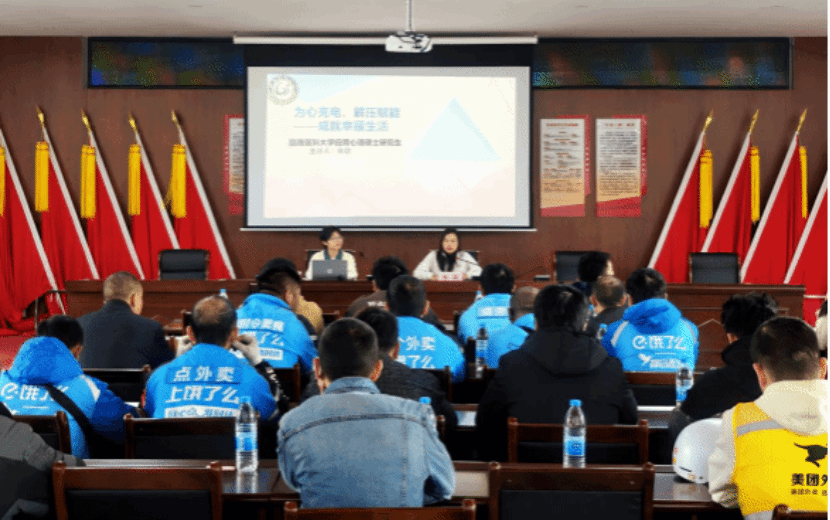 23日下午,朱熠以《为心充电,解压赋能——成就幸福生活》为题开讲心理健康课。针对外卖骑手、快递员等群体常面临的超时配送、投诉压力等问题,他结合案例解析压力对身心的影响,传授“STOP情绪调节技术”“4-7-8腹式呼吸法”等实用技巧,带领学员开展互动按摩操,现场氛围轻松活跃,帮助新就业群体掌握科学解压方法,以积极心态面对工作生活。李晓文携学校“小药箱健康+”志愿服务队,为参训新就业群体赠送100个急救小药箱。药箱内配备碘伏、创可贴、晕车药等常用物资,贴合户外工作需求。志愿队成员还现场讲解药品使用方法,传递健康防护知识,用实际行动践行“红医志愿服务进基层、进社区,感知社会、服务群众”的理念。